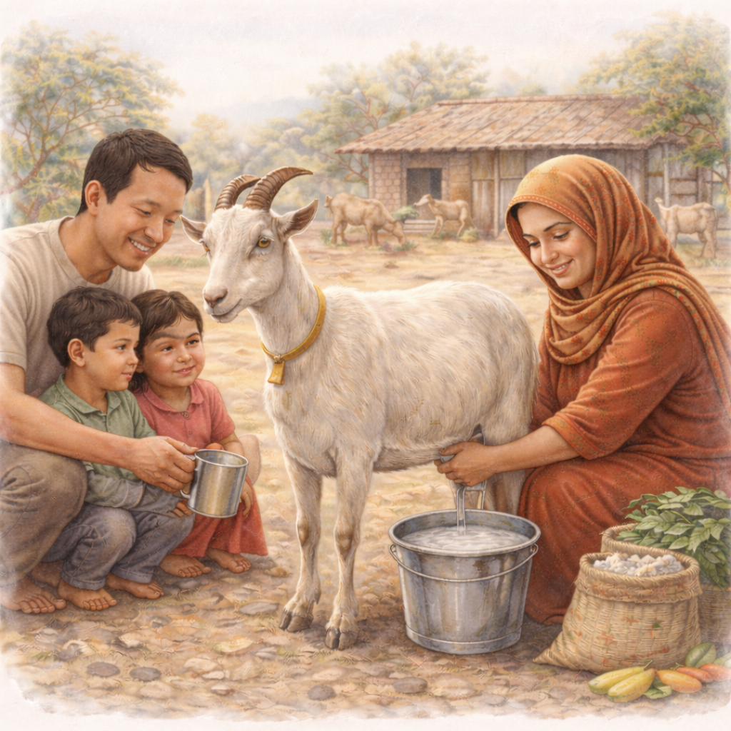 Milchgebende Ziege: Besonders geeignet für kleinere Familien oder solche mit weniger Platz. Ziegen sind pflegeleicht, benötigen wenig Futter und liefern dennoch täglich wertvolle Milch, die für die Ernährung genutzt oder auf dem lokalen Markt verkauft werden kann.