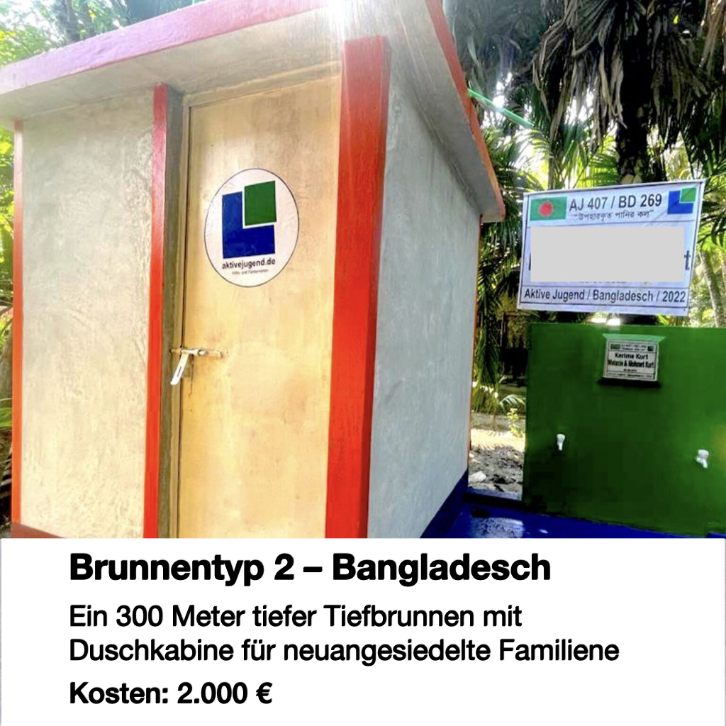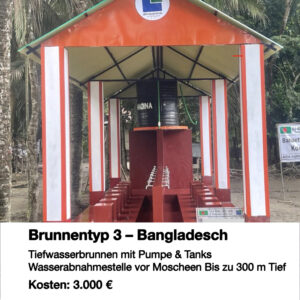 Der Wasserbrunnen Typ 2 wird in Bangladesch errichtet, insbesondere in Regionen, in denen Menschen durch Überschwemmungen ihre Häuser verloren haben und neu angesiedelt wurden. Es handelt sich um einen 300 Meter tiefen Tiefbrunnen, der eine zuverlässige Versorgung mit sauberem Trinkwasser sicherstellt.
