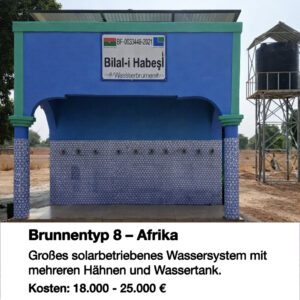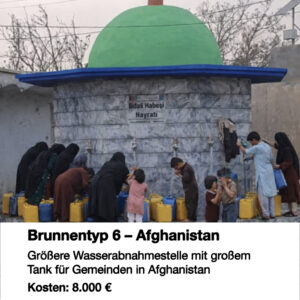 In Afghanistan werden große Wasserstationen mit zentralem Tank errichtet. Diese versorgen ganze Stadtviertel oder Dörfer mit mehreren Wasserabnahmestellen gleichzeitig. Besonders geeignet für Gebiete, in denen ein einzelner Brunnen nicht ausreicht.