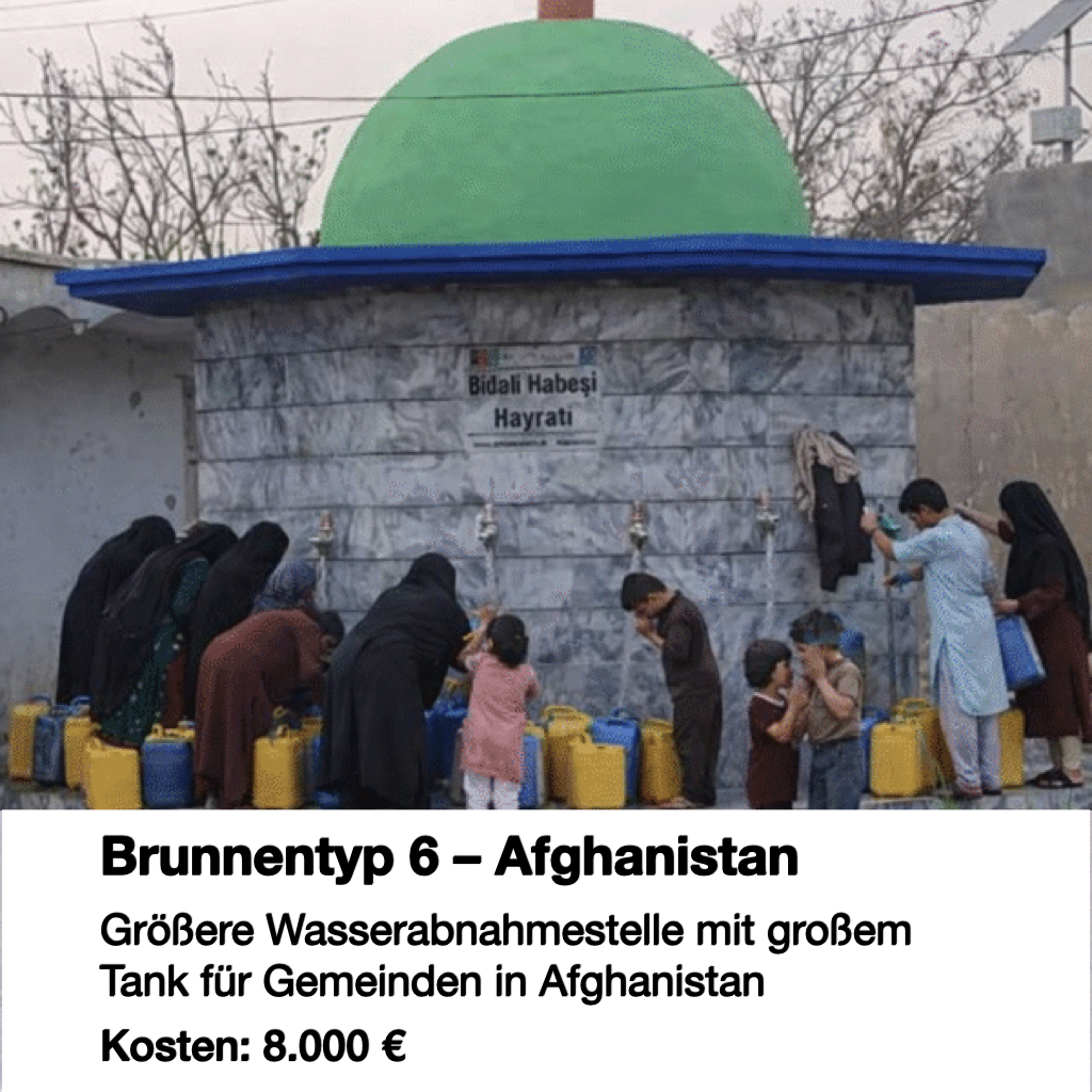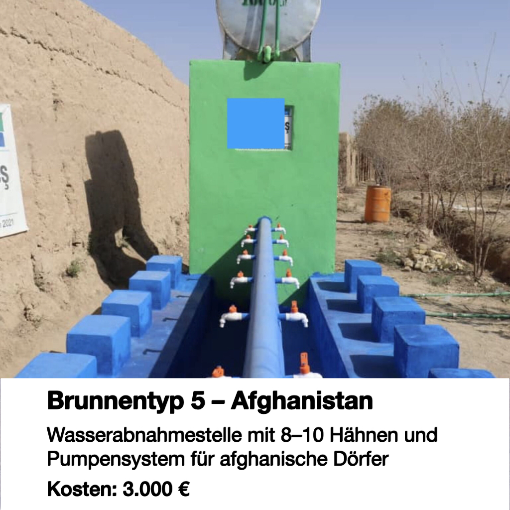 Diese Wasserstation wird in afghanischen Dörfern gebaut, die keinen Zugang zu sauberem Wasser haben. Mit einem integrierten Pumpensystem und mehreren Wasserhahnen können ganze Gemeinschaften hygienisch und effizient versorgt werden. Besonders vor Moscheen oder Gemeinschaftsplätzen einsetzbar.