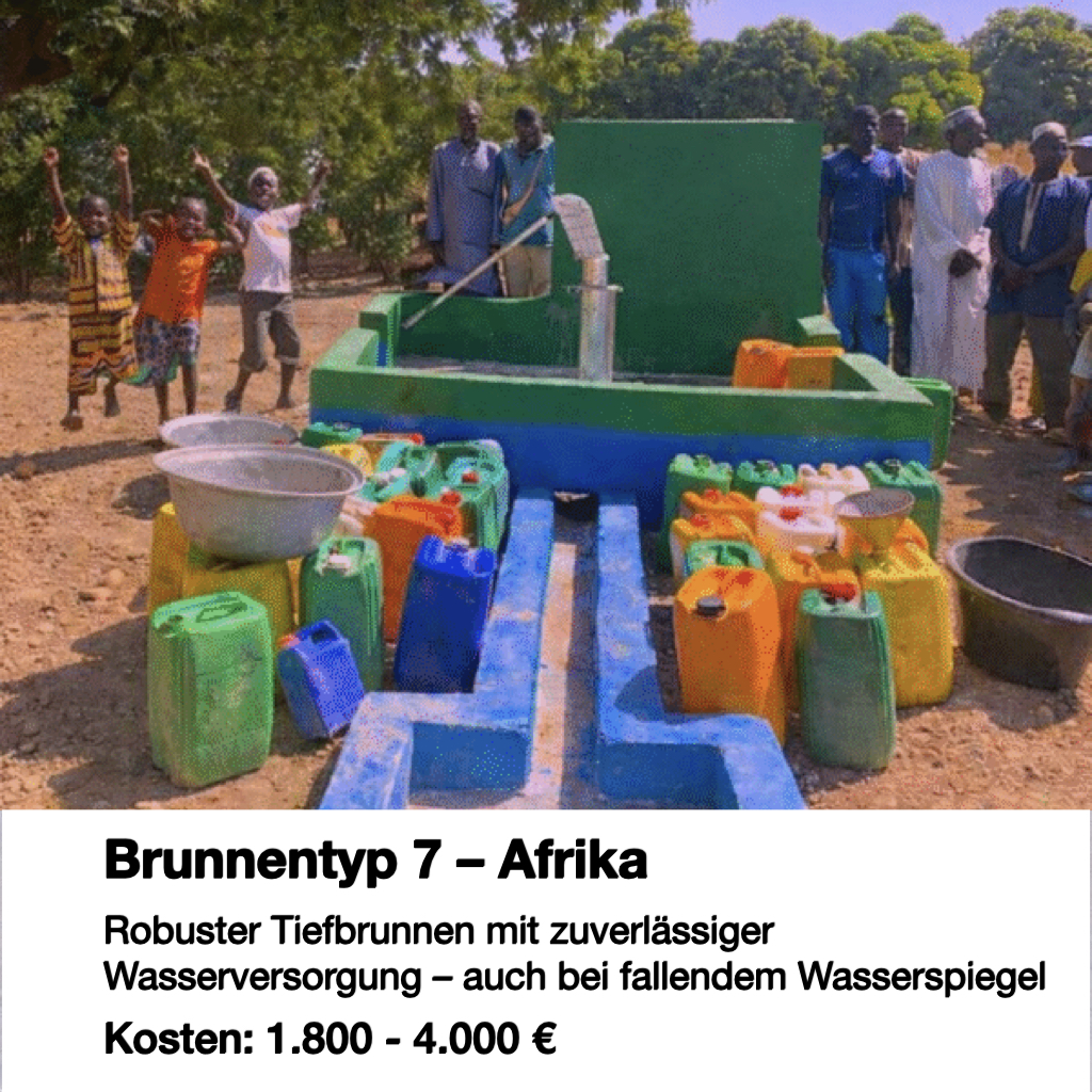 In vielen afrikanischen Ländern werden besonders tief gebohrte Brunnen gebraucht, da der Wasserspiegel saisonal stark schwankt. Diese Brunnen garantieren eine dauerhafte Versorgung mit Trinkwasser, selbst in trockenen Jahreszeiten. Sie sind mechanisch stabil, langlebig und für ländliche Regionen mit hoher Wassernot ideal geeignet.